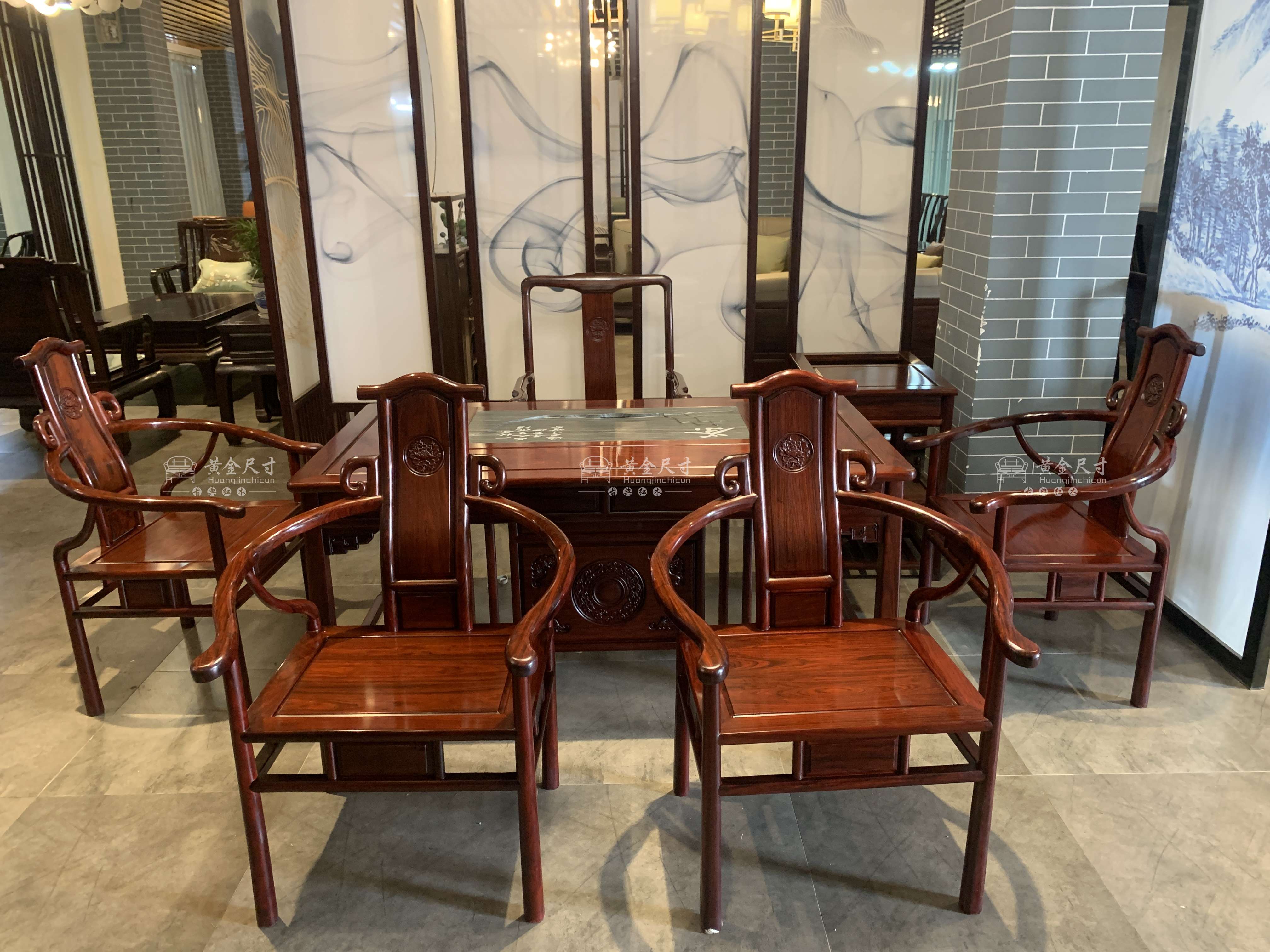 1.53米心如茶台1张,主椅1张,副椅4张,茶水柜1个.